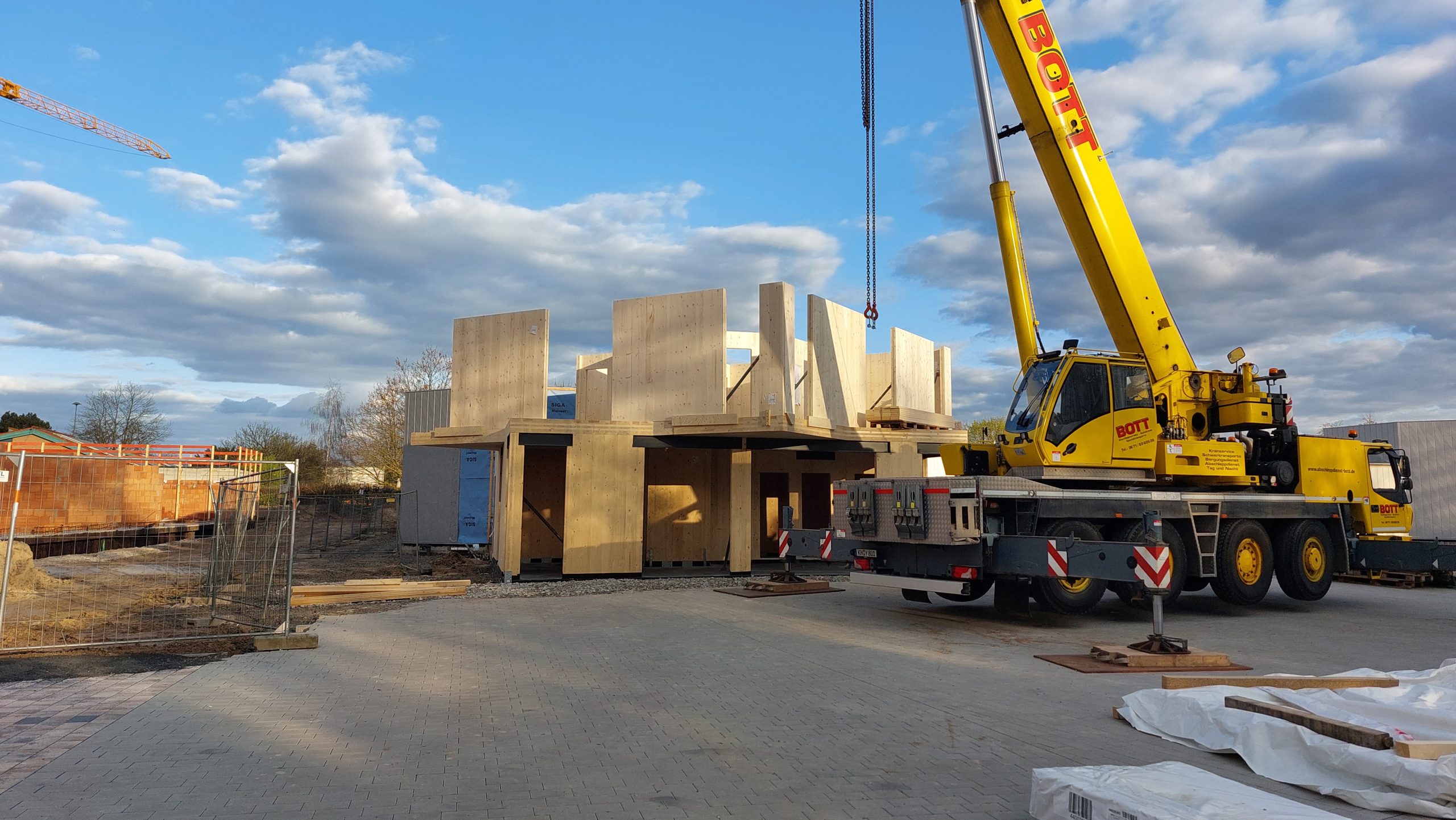 Die vorproduzierten Wand- und Deckenelemente aus Vollholz werden von einem Montageteam der Firma MDL module in Rekordzeit aufgebaut. Es ist schon faszinierend, wenn aus einer Vorstellung Wirklichkeit wird. Der Kran liefert die tonnenschweren Teile in hoher Präzision auf die exakten Positionen. Es ist sehr beeindruckend die Kombination des Eingangsgebäudes mit den Pavillons zu sehen.