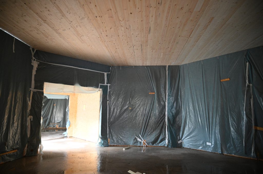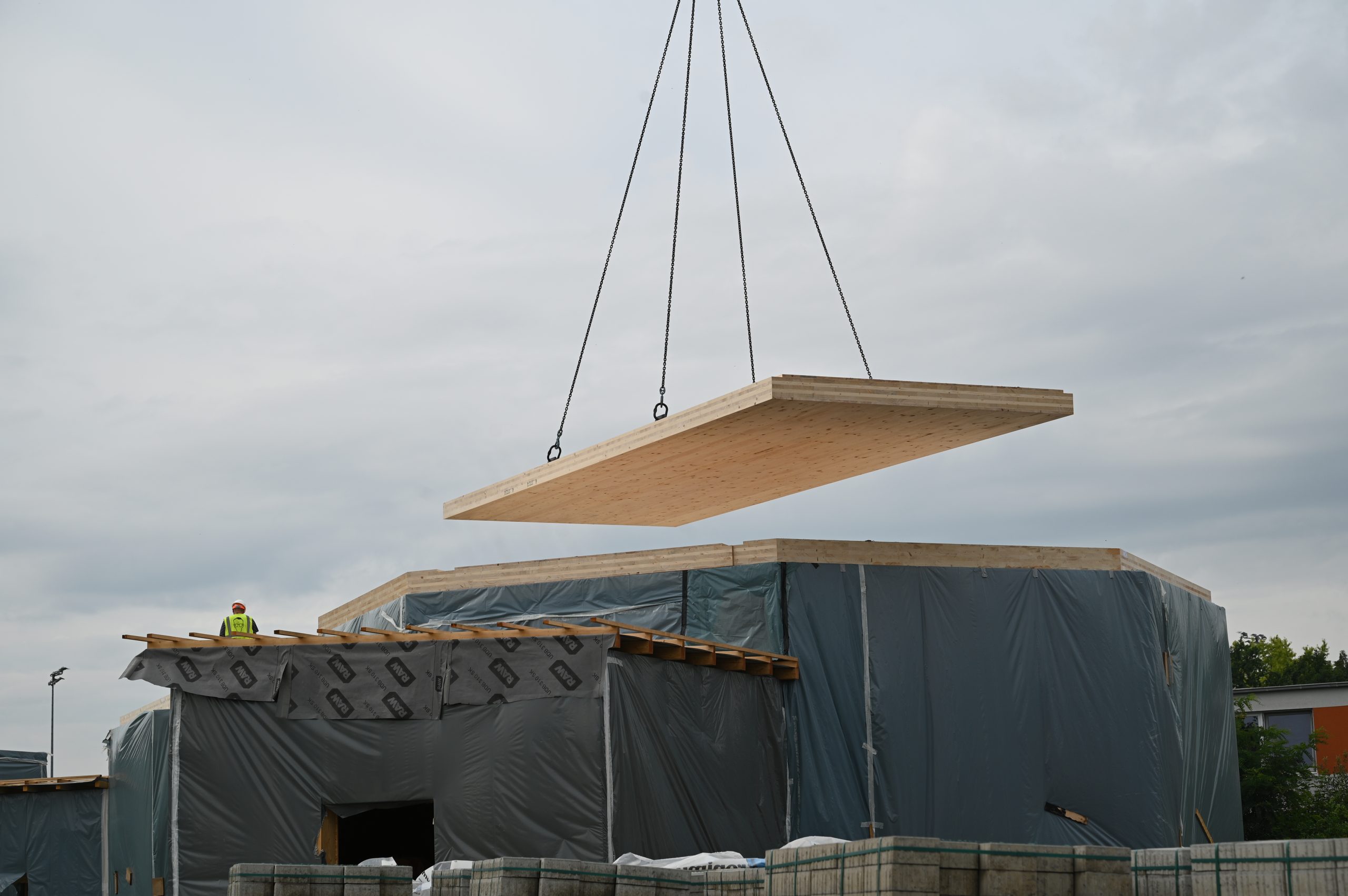 Die Deckenelemente sind schon sehr beeindruckend. Diese riesigen dicken Holzplatten wirken surreal auf mich. Jeder Pavillon wird jetzt mit 3 Deckenelementen abgedeckt – jedes dieser Elemente wiegt ca. 3 Tonnen. Wenn die Platten statisch verbunden sind, kann die Decke freitragend alle Gewichte wie Schneelast oder Solarmodule bewältigen. Es ist total spannend, wie sich die Anmutung der Pavillons jetzt völlig verändert. Nicht zuletzt wird die Akustik des Raumes plötzlich wahrnehmbar.