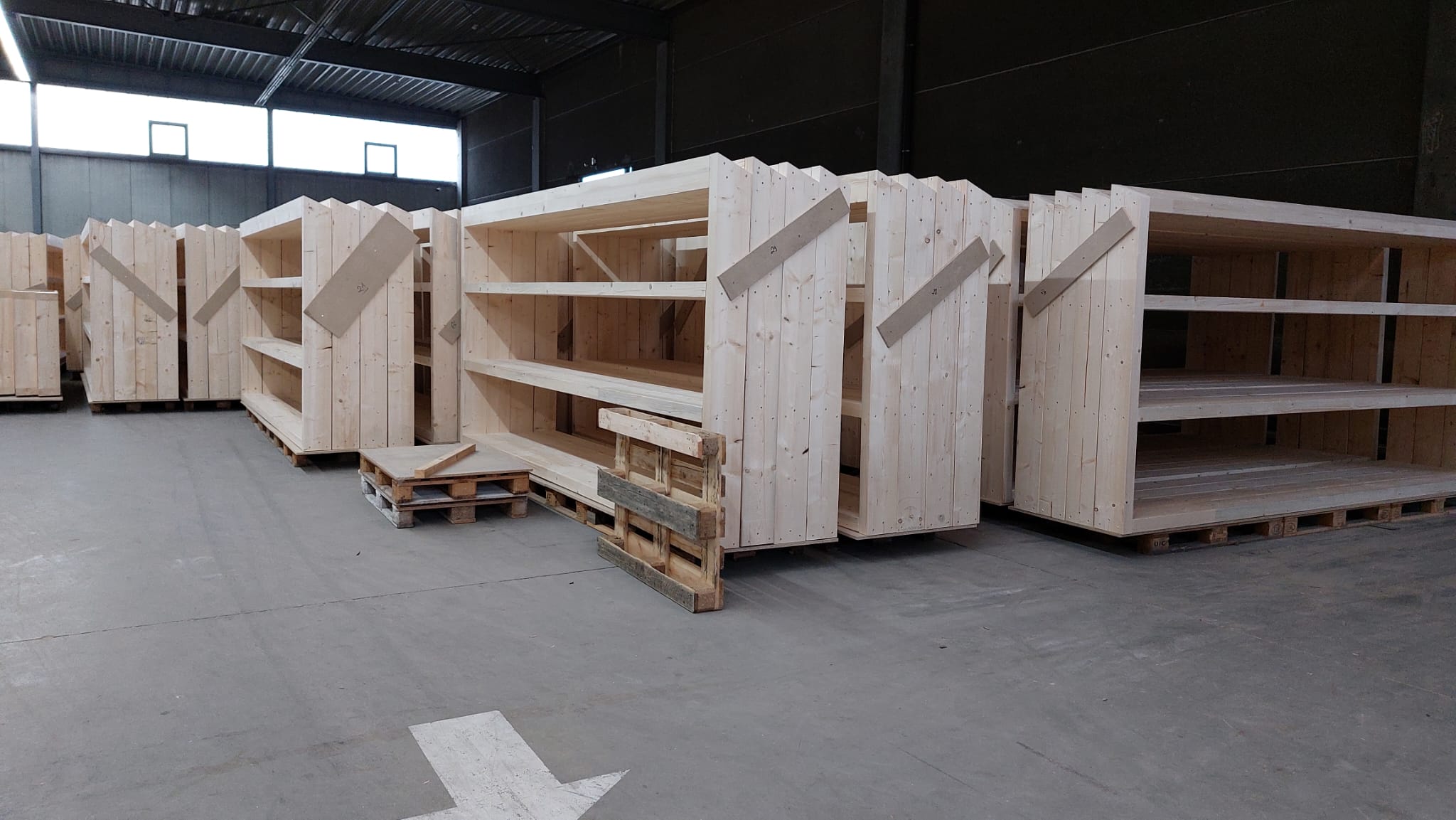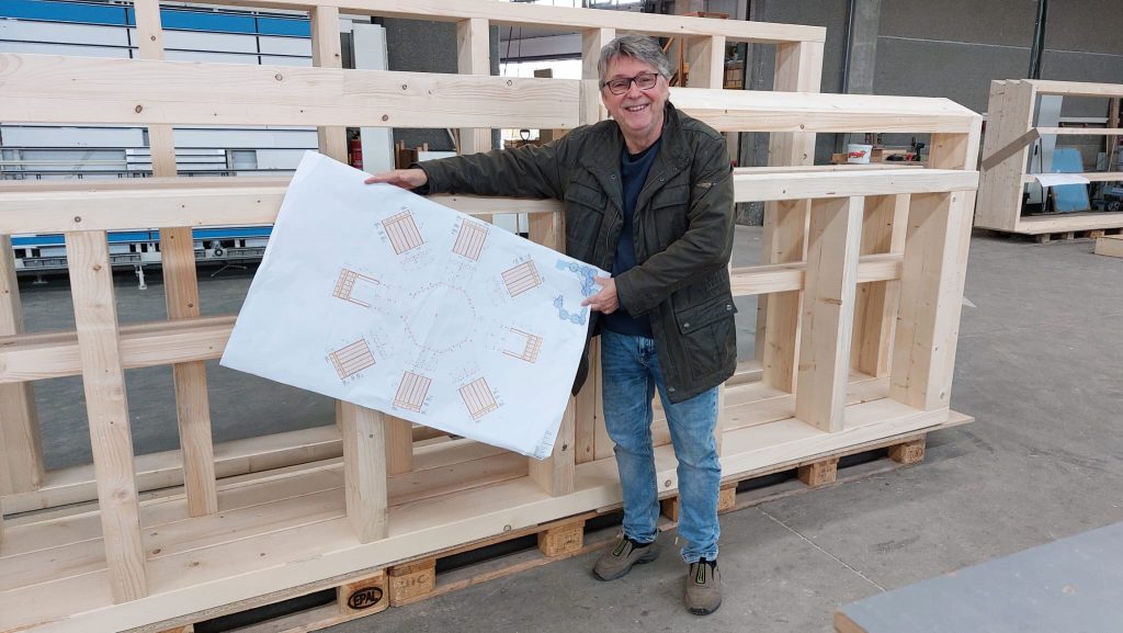 Die Grundelemente aus Holz, die dann zu den einzelnen Seiten der achteckigen Pavillons zusammengefügt werden, sind jetzt im Werk von MDL in Bischofsheim (www.mdl-module.com) zusammengebaut worden.
