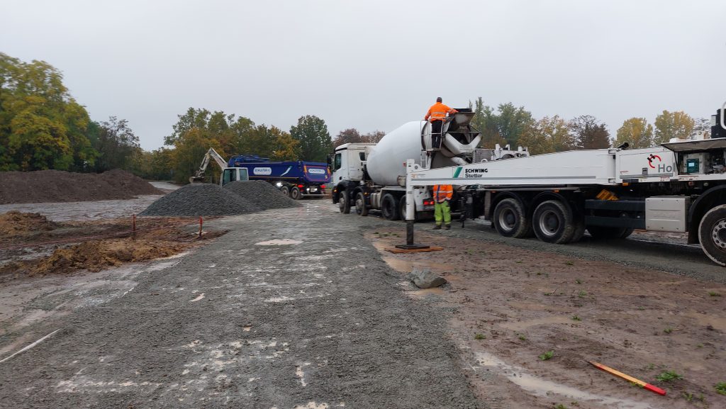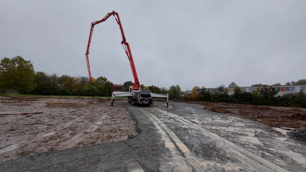 Das war eine ziemlich unangenehme Sache … bei Regen und Wind im Matsch stehen und die Fundamentgräben mit Beton verfüllen. Heute ist richtig viel Betrieb auf der Baustelle. Die große Betonpumpe wurde schon ab 8 Uhr aufgebaut, insgesamt 4 Betonlaster kamen ab 9 Uhr an, große Mengen an Schotter wurden angeliefert und eine Menge an Kanthölzern für die Schalung. Ich habe den allergrössten Respekt vor den Bauarbeitern, Kranführern, Zulieferern und allen anderen, die bei diesem Mistwetter auf der Baustelle arbeiten. Gleichzeitig bin ich total begeistert, weil ich zusehen kann, wie eine Idee von mir Stück für Stück real wird. Auch wenn es noch ein langer Weg ist.