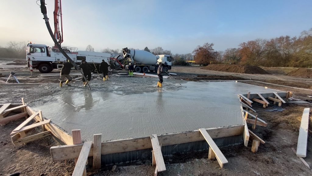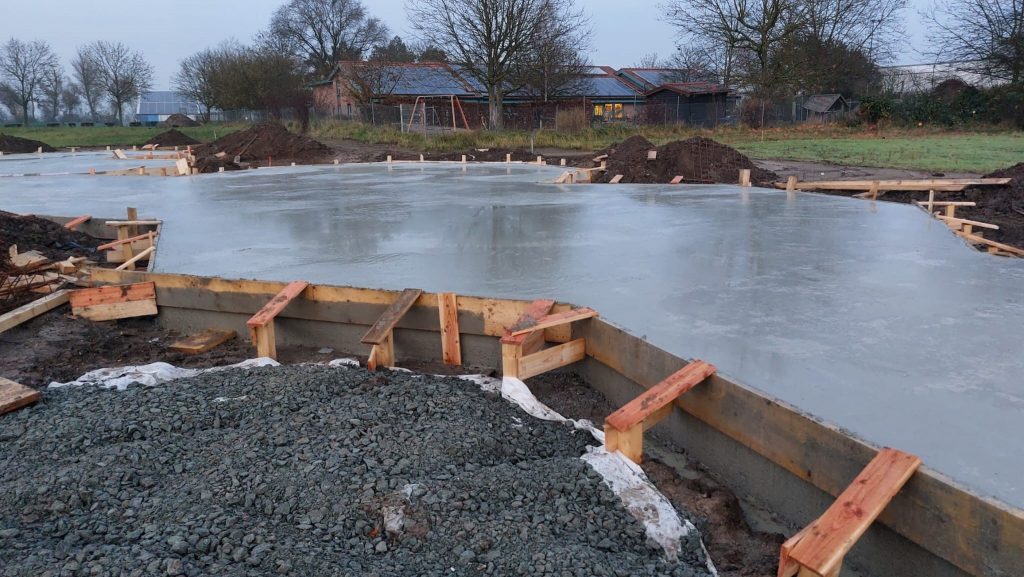 Bei klarem Himmel und Temperaturen um den Gefrierpunkt beginnen die Arbeiter der Firma KOC (www.koc-galabau.de) gegen 8 Uhr mit dem Betonieren der ersten Bodenplatte. Der Beton wird eingefüllt, verteilt, verdichtet und anschließend geglättet – eine ziemliche Plackerei. Dabei wird permanent die Höhe der Oberfläche kontrolliert. Die Oberfläche des frisch abgezogenen Betons wirkt einladend wie ein Pool – die momentane frostige Lufttemperatur verscheucht die Illusion.