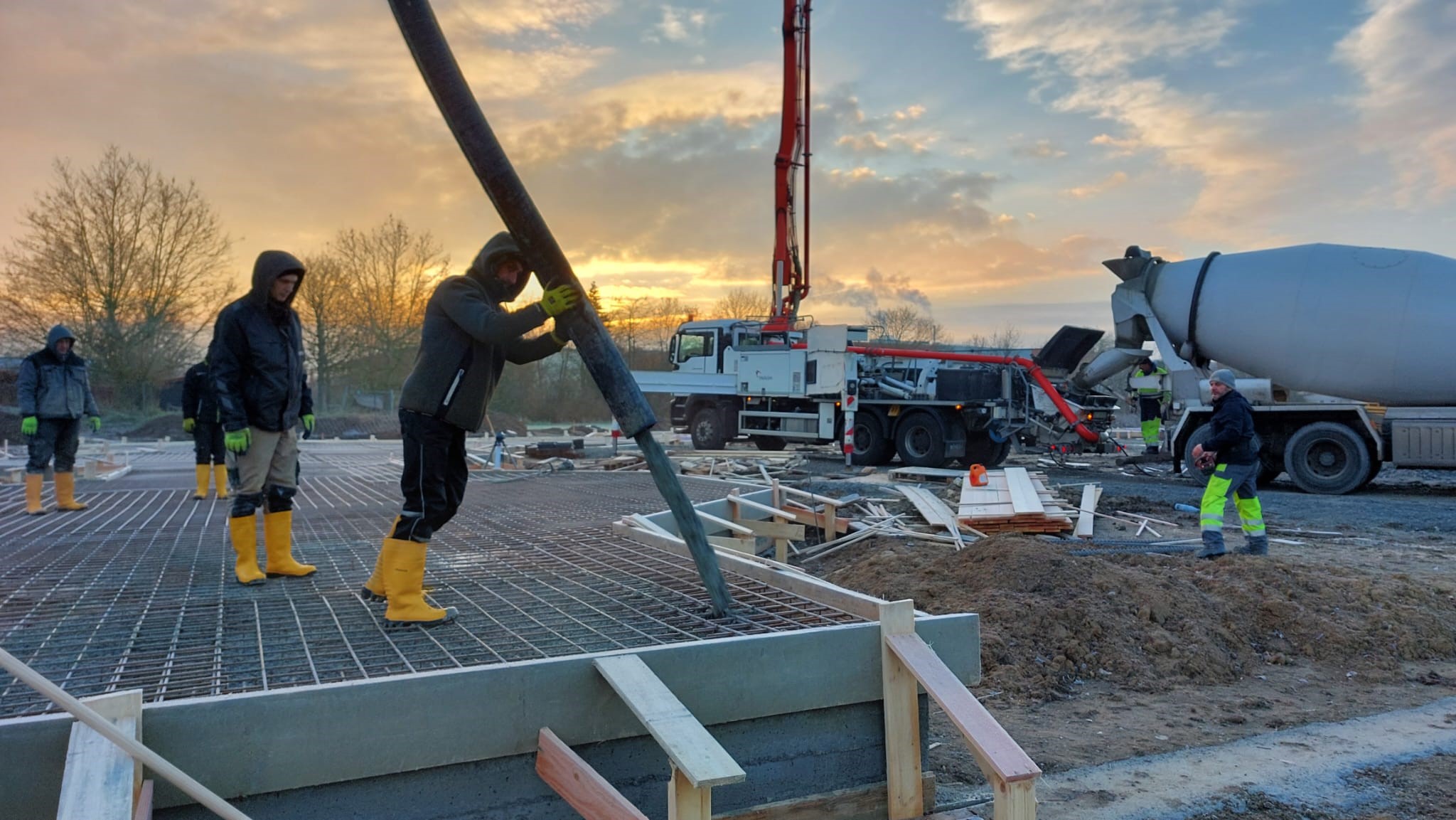 Im Lauf des Tages fahren 24 LKW mit jeweils 8qm Beton auf die Baustelle und laden dort alles in den Trichter der Betonpumpe ab. Am Nachmittag lässt das Tageslicht nach und gerade noch rechtzeitig wird die 8. Bodenplatte fertig. Eine tolle Leistung.